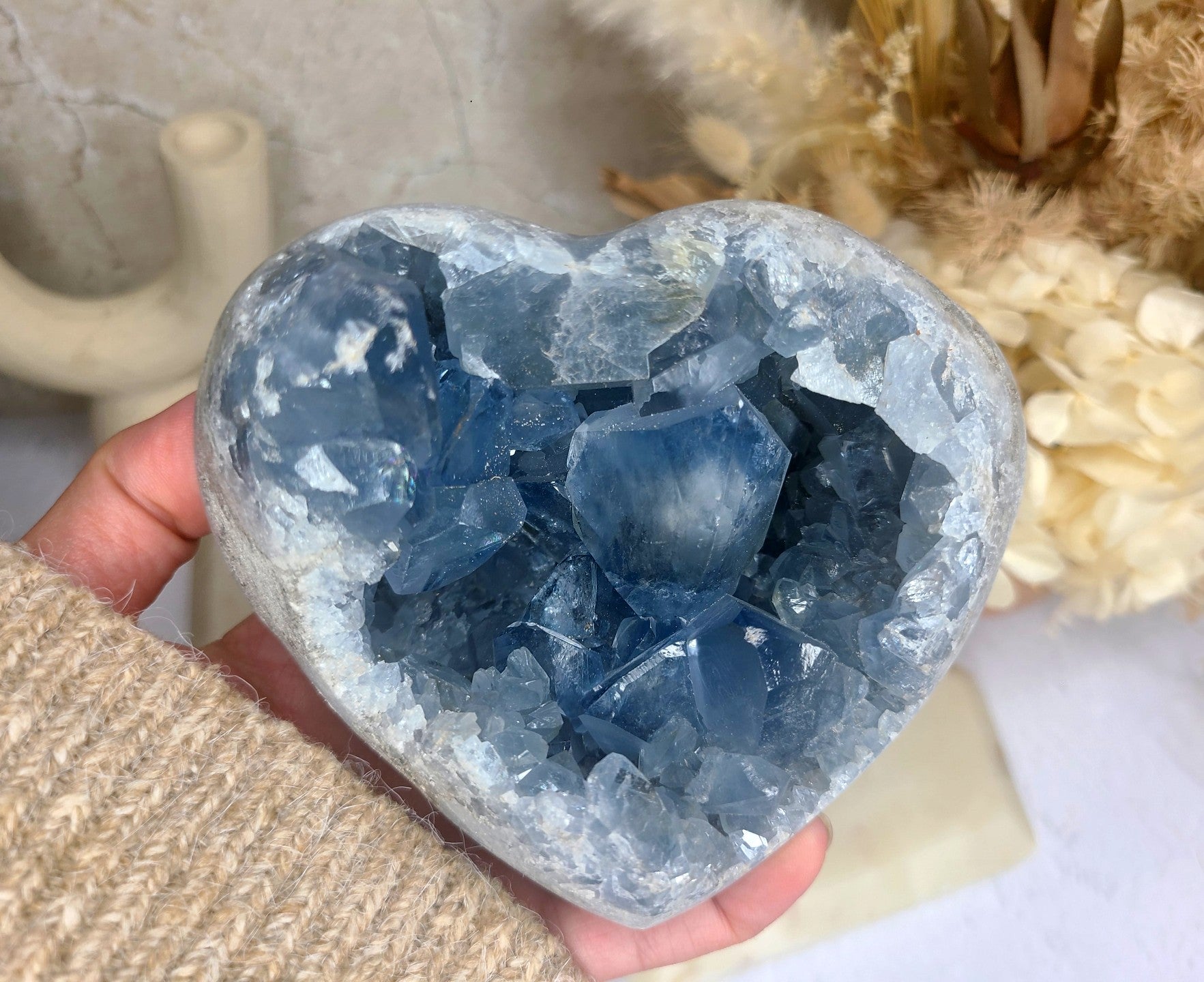 This high grade Celestite heart, features incredible, huge gemmy terminations and magical rainbows throughout, radiating the most gentle and calming energy. Its deep blue hue and delicate crystalline structure creates a sense of tranquillity and peace. More than just a beautiful object, this Celestite heart offers a wealth of metaphysical benefits and can enhance the energy of your living space.