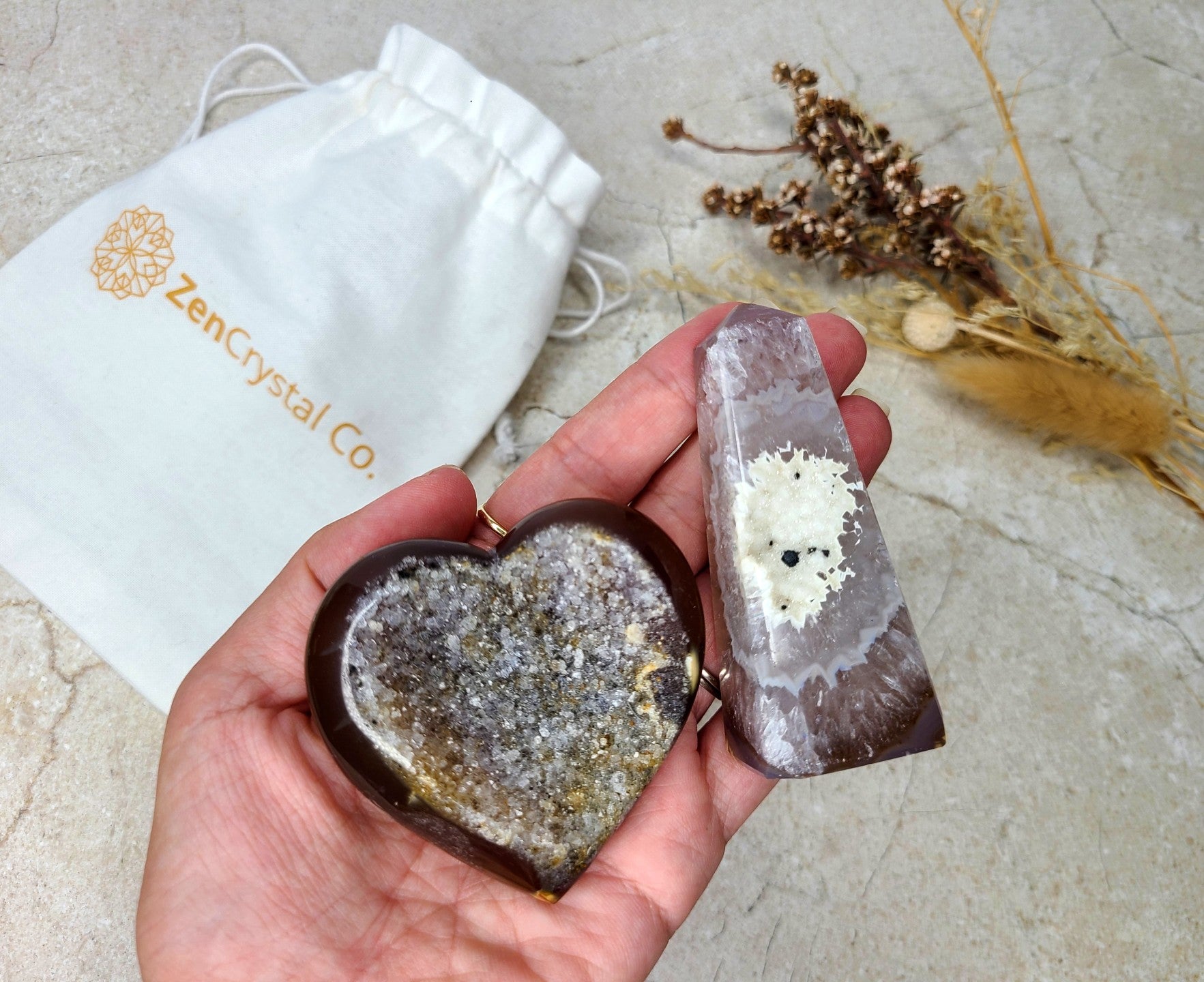 Paired with this heart is a striking Druzy Agate Obelisk , which directs and focuses these earthy energies upwards, enhancing clarity, concentration, and a connection to higher consciousness. Together, these two pieces create a powerful synergy, grounding your spirit while opening you to greater awareness and a sense of well-being.