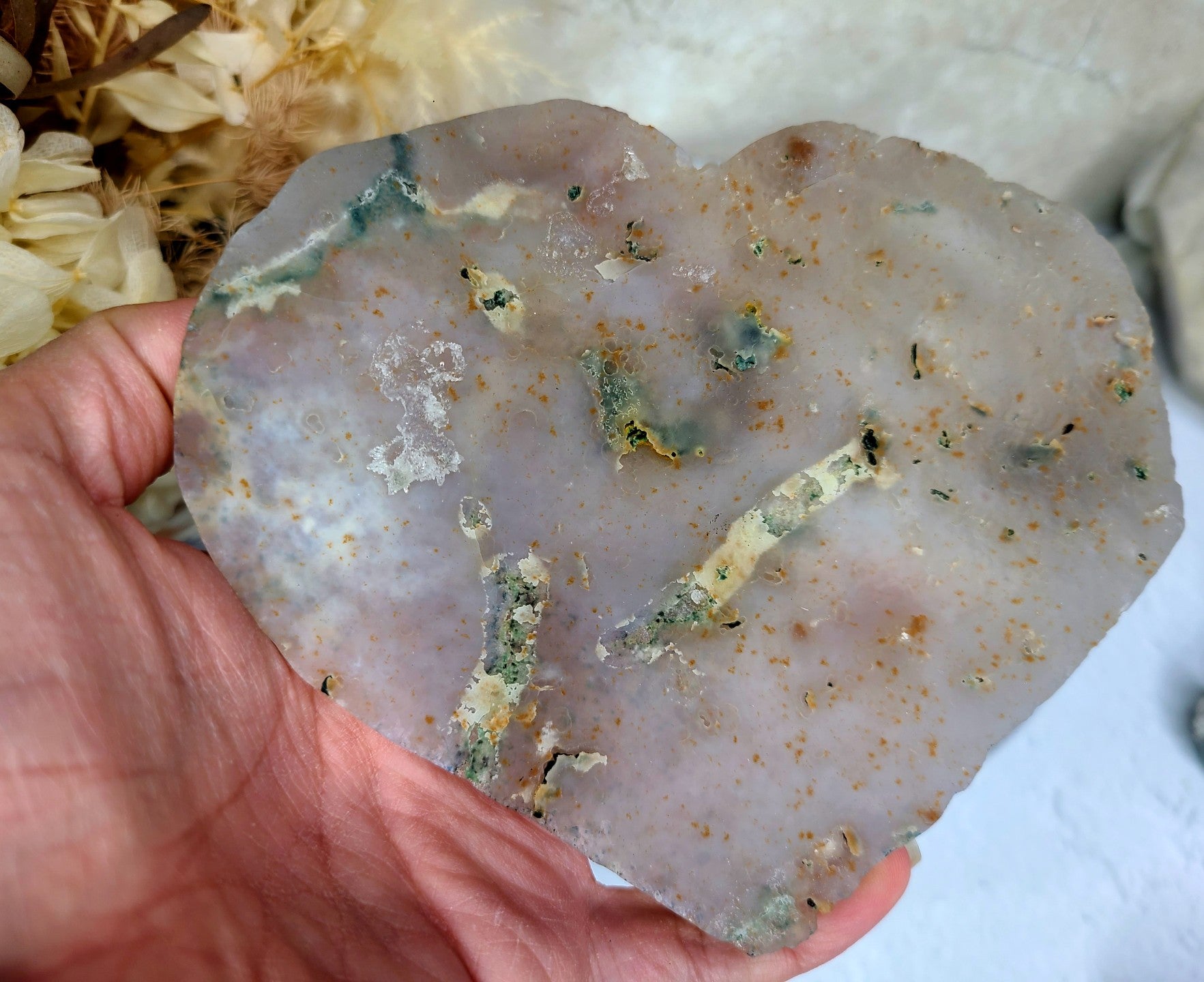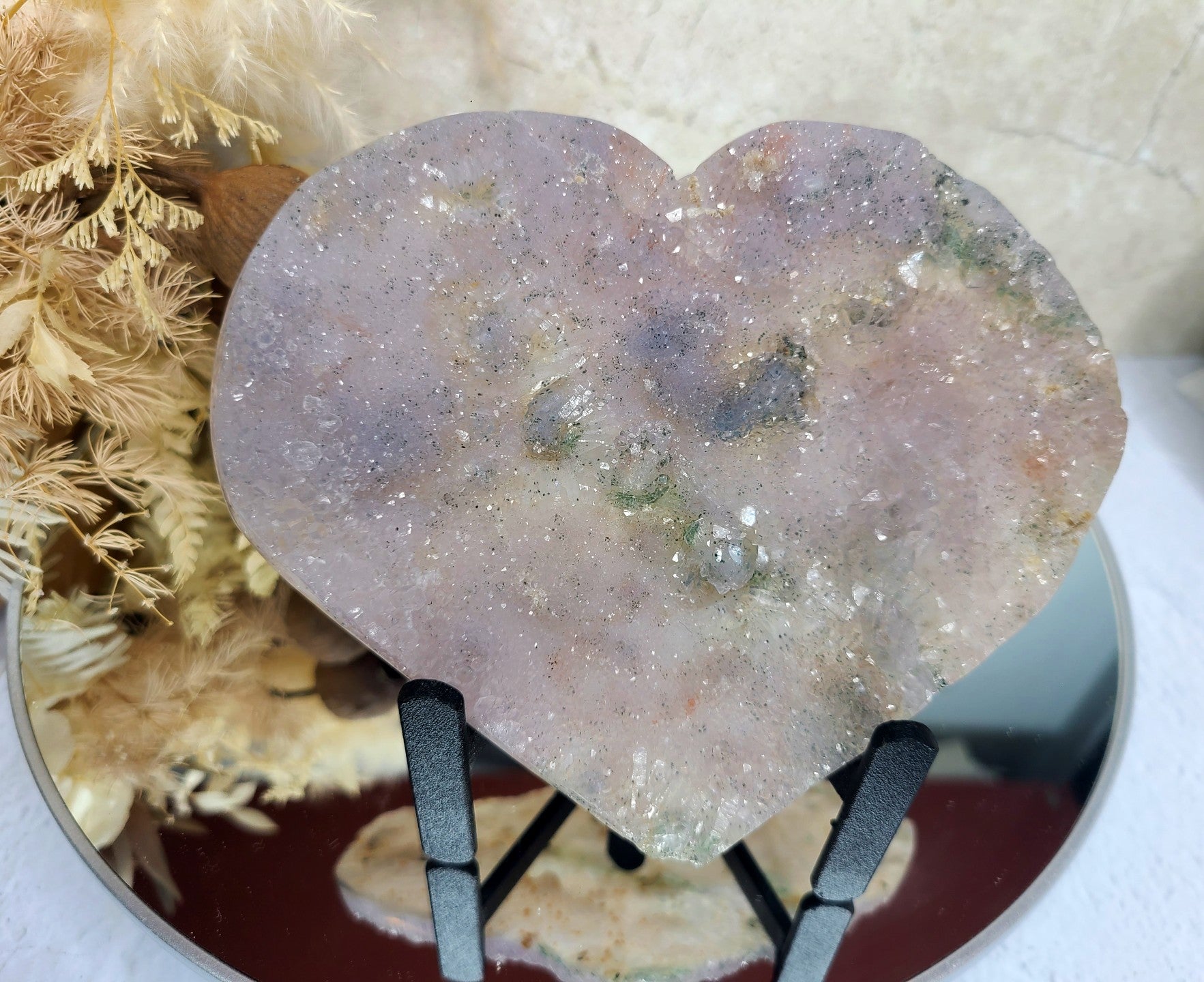The “flowers” within this amethyst heart are said to open the mind to higher consciousness and intuitive insights. Amethyst is closely linked to the Third Eye and Crown chakras, serving as a powerful tool for enhancing spiritual awareness. It can help you access deeper wisdom, clarify your dreams, and strengthen your connection to your higher self and the divine. This heart serves as a beautiful reminder to trust your inner voice and follow your spiritual path with clarity and conviction.