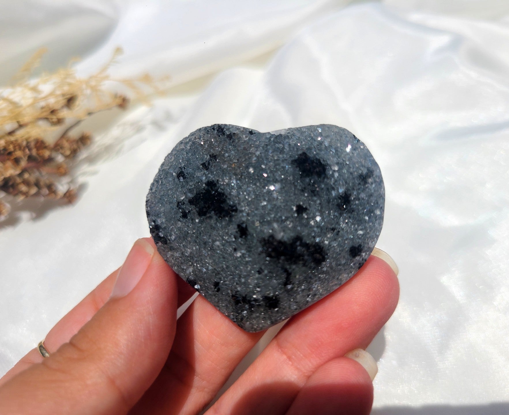Sourced from Uruguay, this unique heart showcases the beauty of Black Galaxy Amethyst, a rare and captivating natural beauty. Its shimmering crystals are reminiscent of distant stars, offering a glimpse into the vastness of the cosmos.