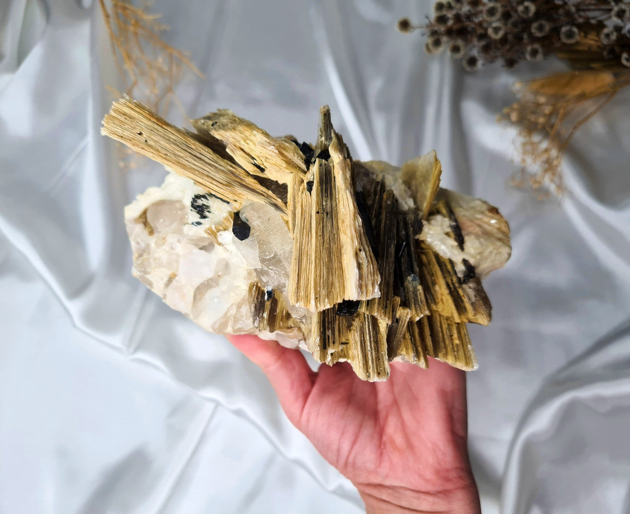 An absolute WOW piece that will absolutley take your breath away! This Golden Mica specimen features the most amazing golden lustre on the multiple layers of flakey Mica, with Black Tourmaline inclusions on a Quartz matrix. This natural masterpiece weighs in at just under 2 kilograms and is an unusual masterpiece of complex crystal growths that you will not be able to take your eyes off. A definite collector piece and one of a kind crystal for any crystal collection and exception statement piece of crystal decor to elevate your space.