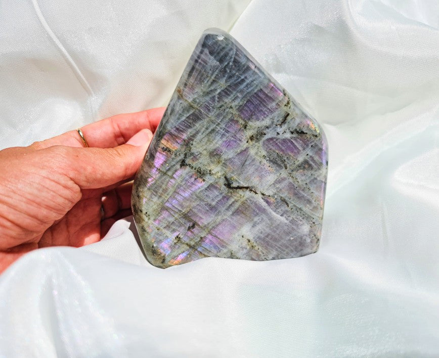 Sourced from Madagascar, this stunning Labradorite Free Form weighs just over 1 kilogram and features deep, mystical purple that dances with flashes of violet, orange, pink & even hints of yellow. This mesmerising display of colours is a result of a different mineral composition, making Purple Labradorite a rarer & more sought-after stone.